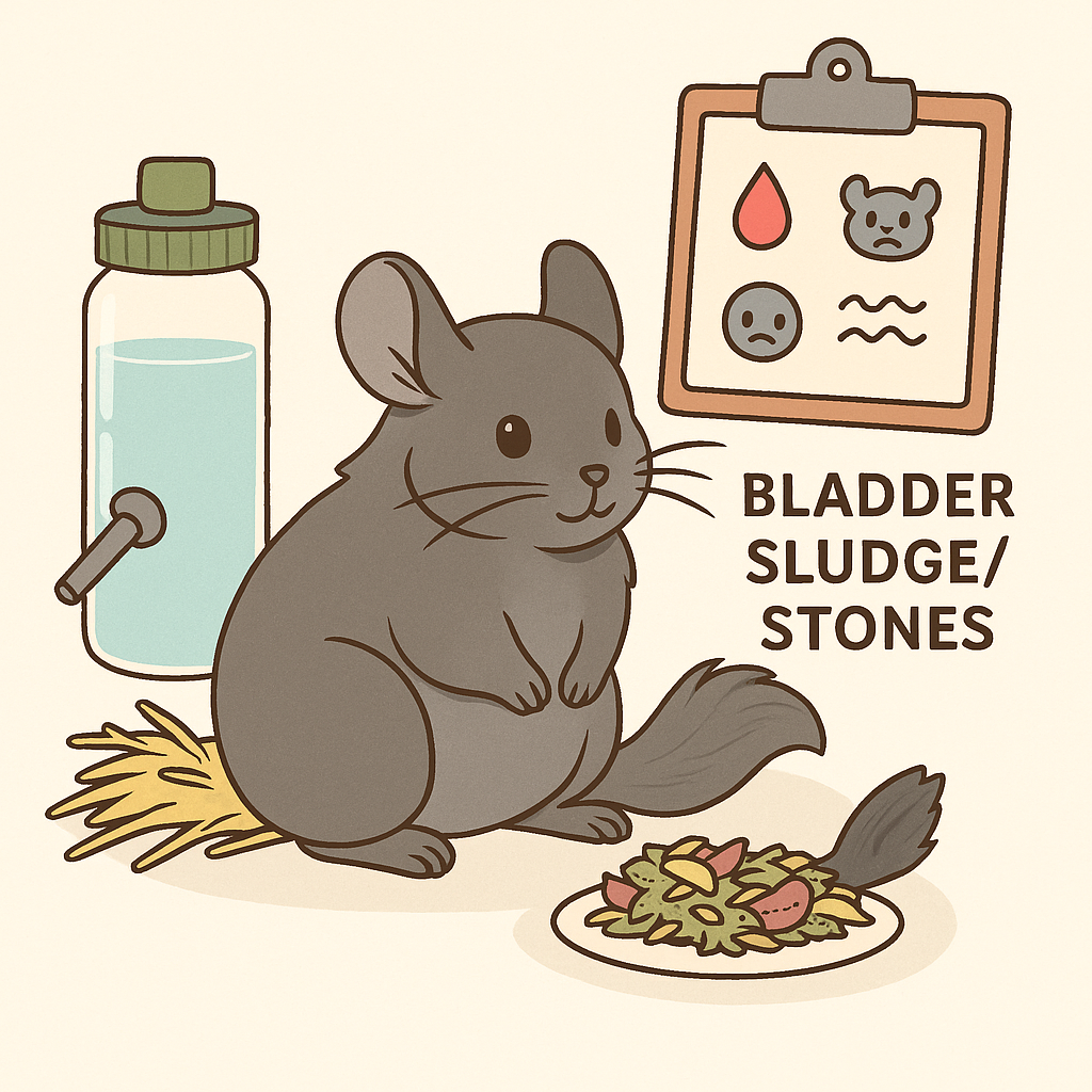 Causes, warning signs, treatment, and how to help prevent them. ![]() In mild cases, this becomes sludge (thick, gritty urine). In more severe cases, minerals form solid stones that can cause pain, inflammation, or dangerous blockages. Chinchillas often hide discomfort, so catching early signs is important. ⸻ ✅ What Causes Bladder Issues? Chinchillas have naturally mineral-rich urine, but stones or sludge are more likely when: • Very high-calcium diet (excess alfalfa or calcium-heavy treats) • Not enough water intake • Genetics / metabolic sensitivity • Limited exercise • Age (older chins develop stones more often) Some chins form stones even with a perfect diet — so it’s not always owner-caused. ⸻ ✅ Common Signs of Bladder Sludge or Stones Watch for: • Straining to pee • Frequent, small urinations • Strong-smelling urine • Pink or red tint in urine • Urine gritty, chalky, or thick • Wet or crusty fur around genitals • Hunched posture, quiet behavior • Sudden refusal to use the litter area • Decrease in appetite Any blood in urine = call a vet immediately. ⸻ ✅ What To Do Right Away If you see any of the signs above: 1. Call an exotic vet 2. Monitor urine output 3. Offer extra water (wet leafy greens only if your vet approves) 4. Keep your chin warm, hydrated, and stress-free Do not give pain meds at home unless prescribed — some medicines worsen kidney stress. ⸻ ✅ How Vets Diagnose A vet may use: • X-rays (to confirm size and location of stones) • Ultrasound • Urine tests • Bloodwork (to check kidney function) Even tiny stones are painful — so getting a diagnosis matters. ⸻ ✅ Treatment Options Treatment depends on severity: ✅ For Sludge • Pain medication • Anti-inflammatory meds • Increased hydration • Diet changes • Flushing the bladder under anesthesia (in some cases) ✅ For Stones • If small: monitored with pain control + hydration • If large or causing blockage: surgical removal A blocked urethra is life-threatening and needs emergency care. ⸻ ✅ Recovery at Home Most chins recover well after treatment with: • Pain medication • Hydration support • Limited jumping/climbing during healing • Close monitoring of urine and appetite Encouraging water intake helps: • Two water bottles in different areas • Glass bottles (cleaner and keeps water fresh) • Fresh hay available at all times ⸻ ✅ Can It Be Prevented? Not always — some chins are genetically prone — but you can lower risk: ✅ Timothy-based pellets ❌ Avoid alfalfa long-term (unless young/special diet) ✅ Clean, fresh water daily (glass bottle preferred) ✅ Lots of exercise ✅ Low-sugar, low-calcium treats ✅ Regular vet checks for older chins ⸻ ✅ When It’s an Emergency Go to a vet immediately if: • No urine output • Severe straining / crying while peeing • Blood clots in urine • Extreme lethargy • Not eating or drinking Urinary blockage can become fatal in hours — fast treatment saves lives. ⸻ ✅ Final Thoughts Bladder issues sound scary, but many chinchillas recover with treatment, pain control, and a few diet adjustments. If something feels “off,” trust your instincts — early care makes a huge difference. You’re doing the right thing just by learning and being prepared. 💛 |